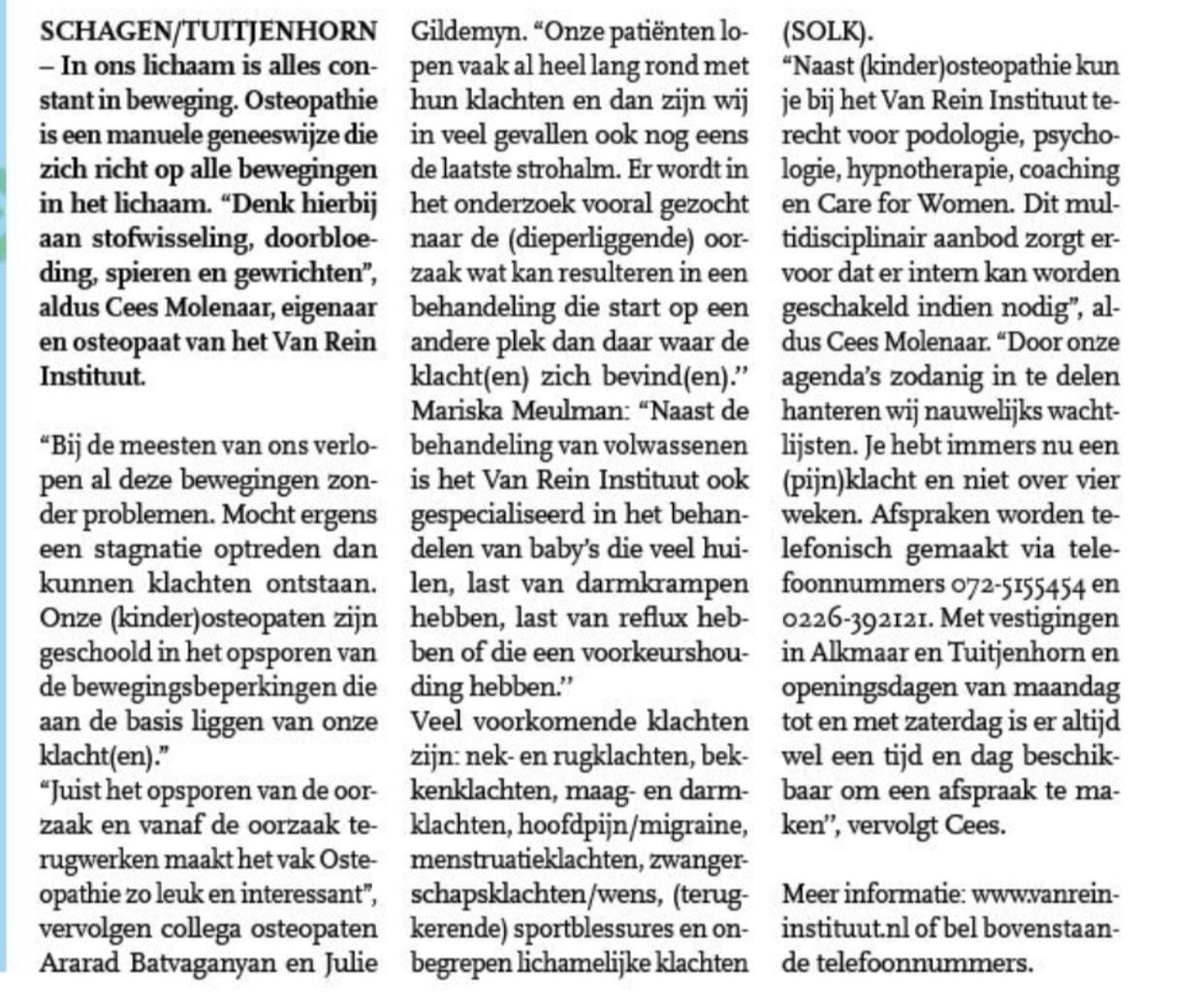 Heb je het stukje over het Van Rein Instituut in het Zondagsblad niet gelezen? Dan kan dat nu door op de foto te klikken...Snel lezen dus!